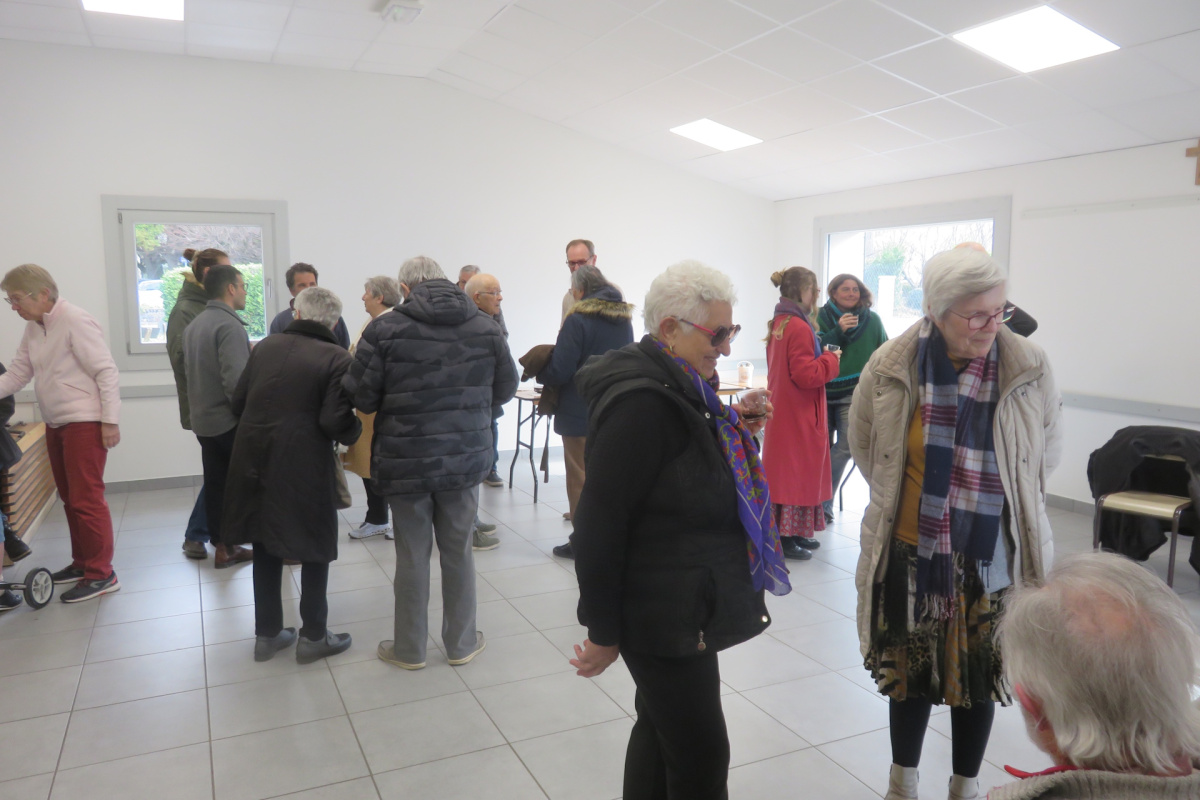 En ce dimanche 1er mars, sous un beau soleil printanier, nous étions assez nombreux pour partager café ou jus de fruits. Ce jour-là, une partie des paroissiens était à Aix les Bains pour fêter les 80 ans de René Pichon.