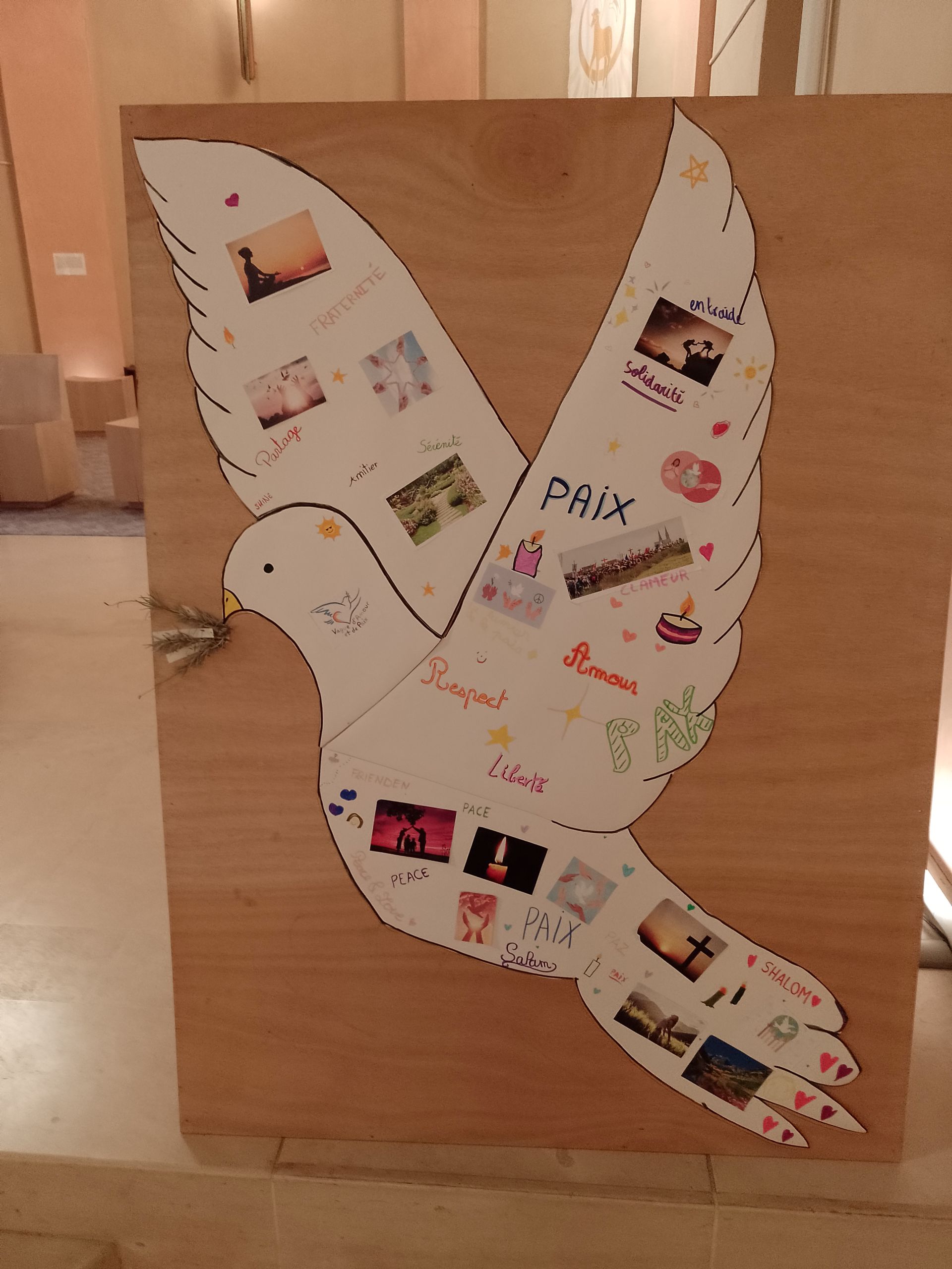 3/ Œuvre commune : Sur un grand panneau chacun décore une partie de la colombe (prédécoupée par avance en mode puzzle) avec des images de ce que représente la paix pour lui. Il inclut la photo du photolangage (voir avec Michèle et sinon photolangage de Aline) : découpage, dessin, écrire un mot en gros et colorier autour. Il peut coller du tissu, bolduc ou autre matériau disponible,