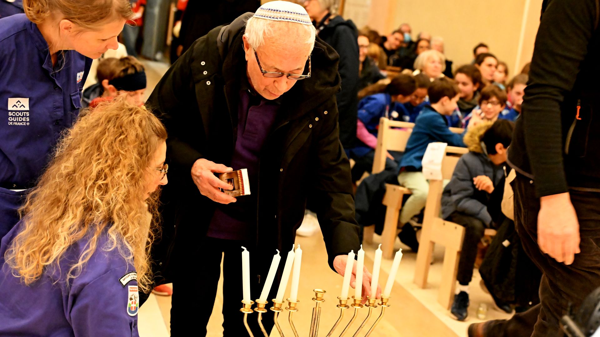 Le hanoukia, le candélabre utilisé pour la fête d’Hanouka, est allumé sur l’autel. Découvrir la fête d’Hanouka ICI