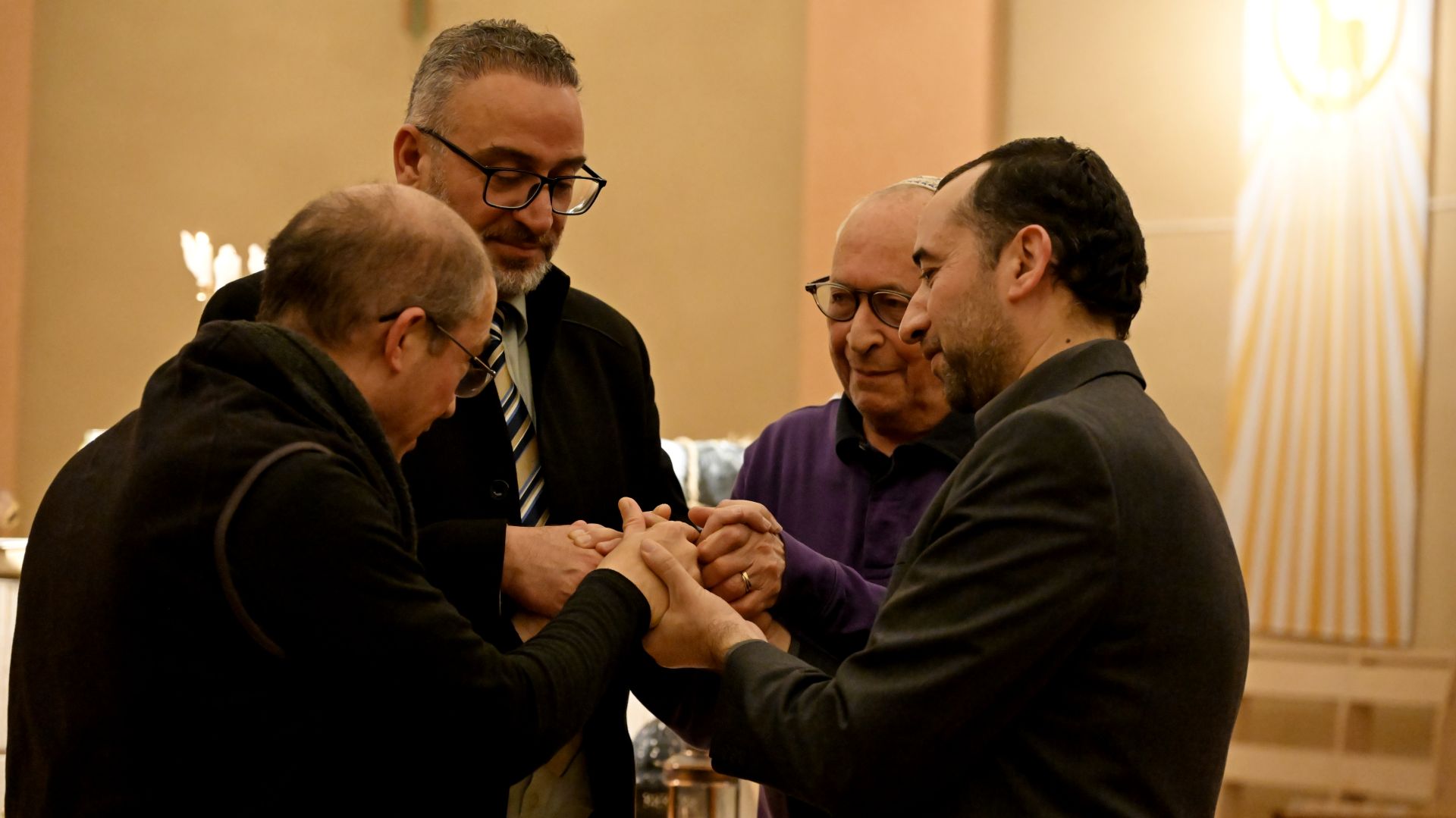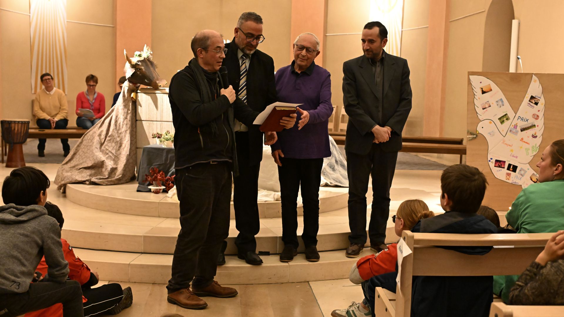 (Poignée de main qui recouvre et protège l’autre main) est introduit par les 3 représentants de leur religion (juive : Albert Fachler, musulmane : Amar Rahal, chrétienne : Alexis Jalabert) qui font le geste ensemble, qui nous inviteront à le faire autour de nous et qui pourront déambuler dans l’église pour le transmettre en leur nom.