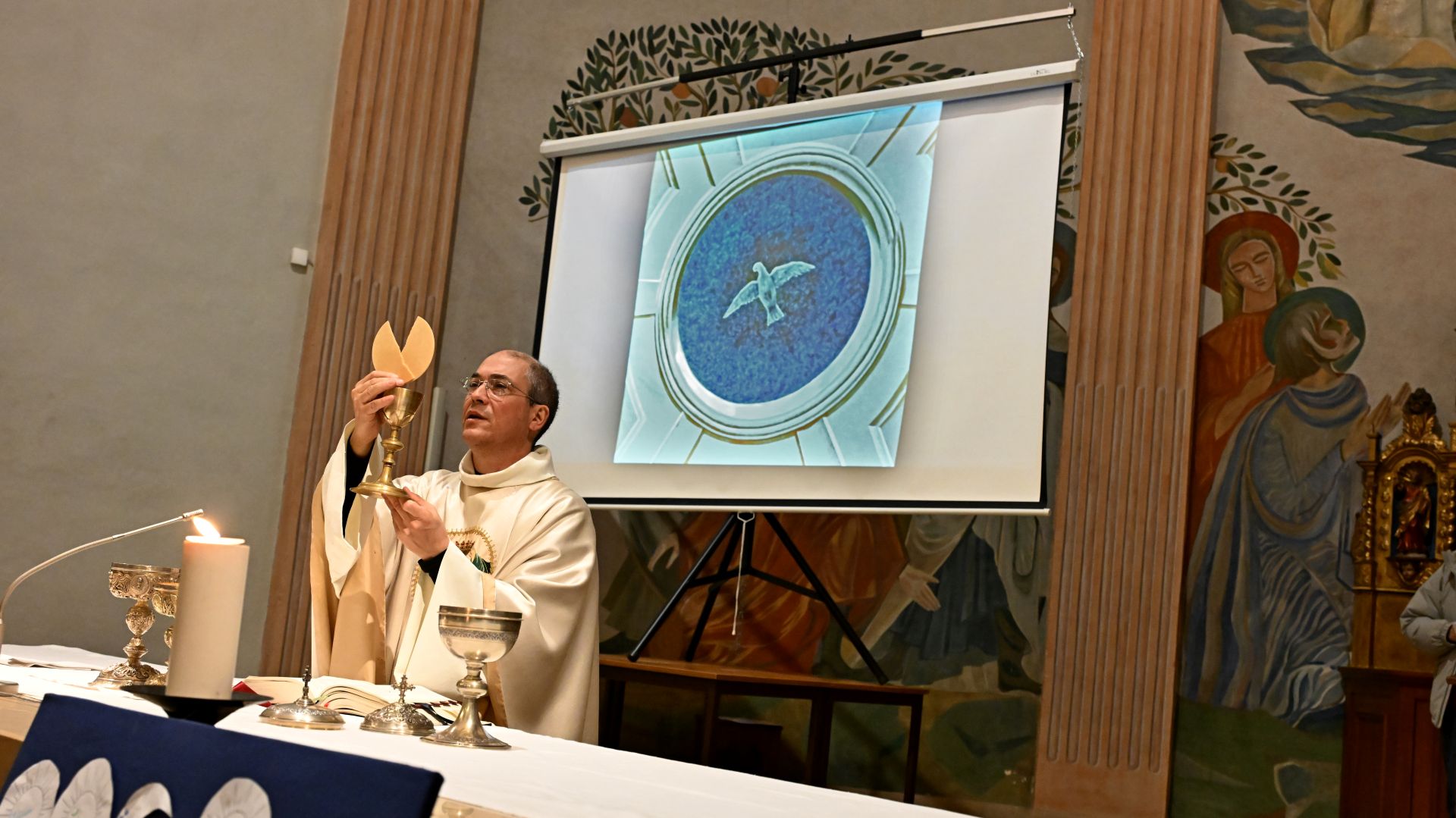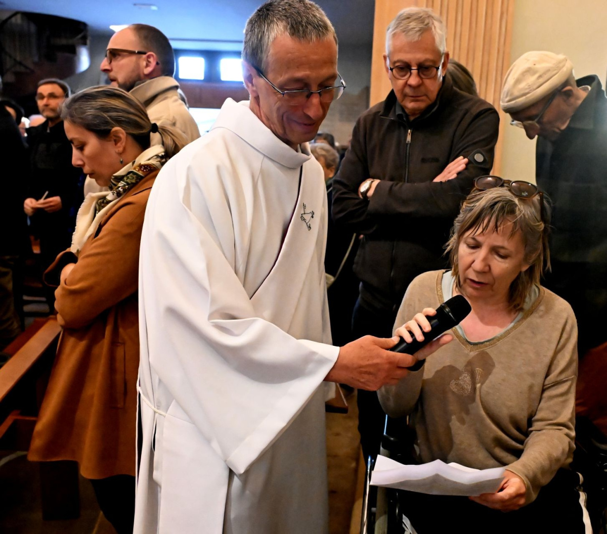 Au moment de la prière universelle sur le thème de la paix, le panneau Colombe réalisé par les enfants et les scouts lors de la rencontre de décembre avec la lumière de Bethléem.