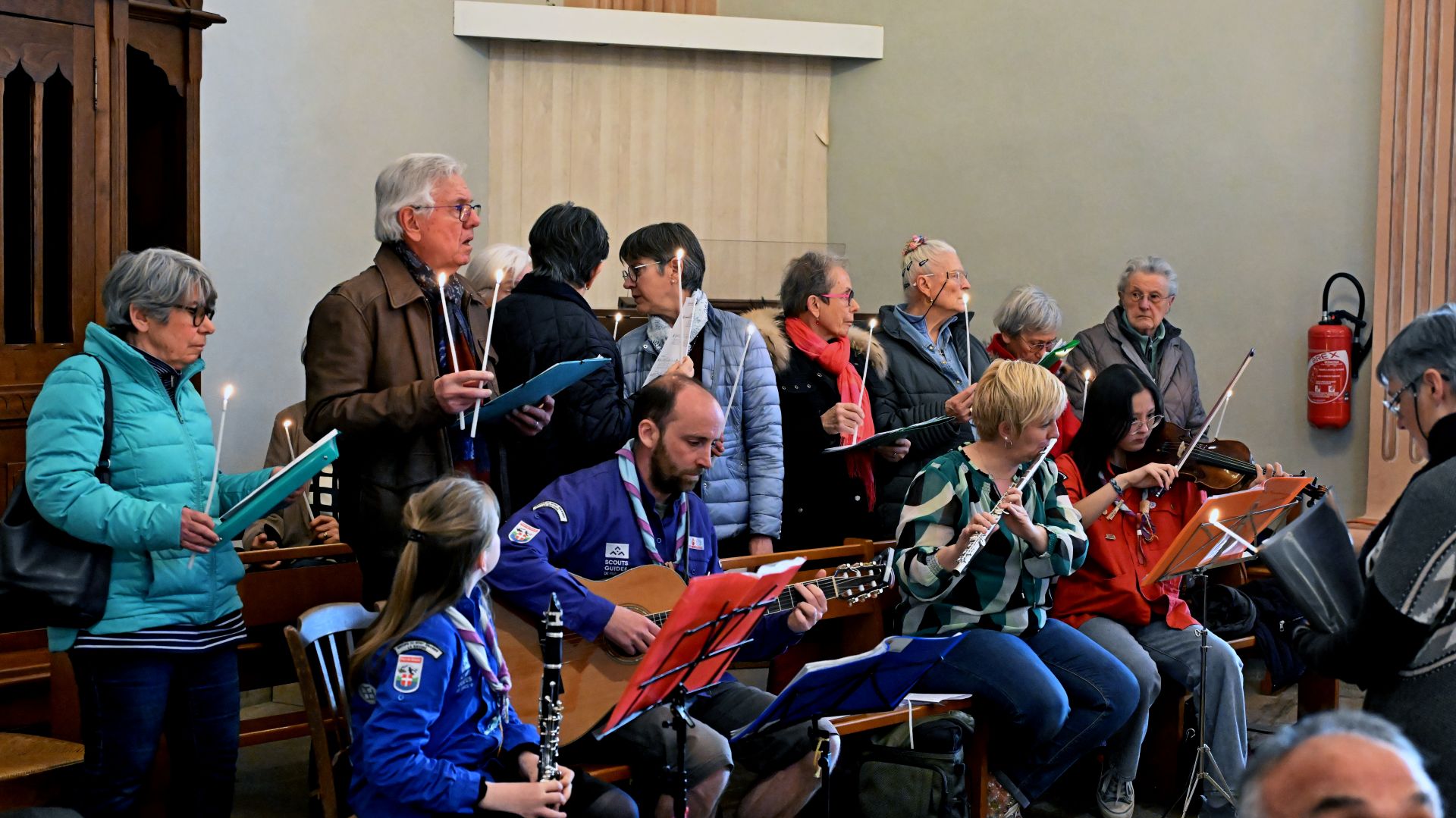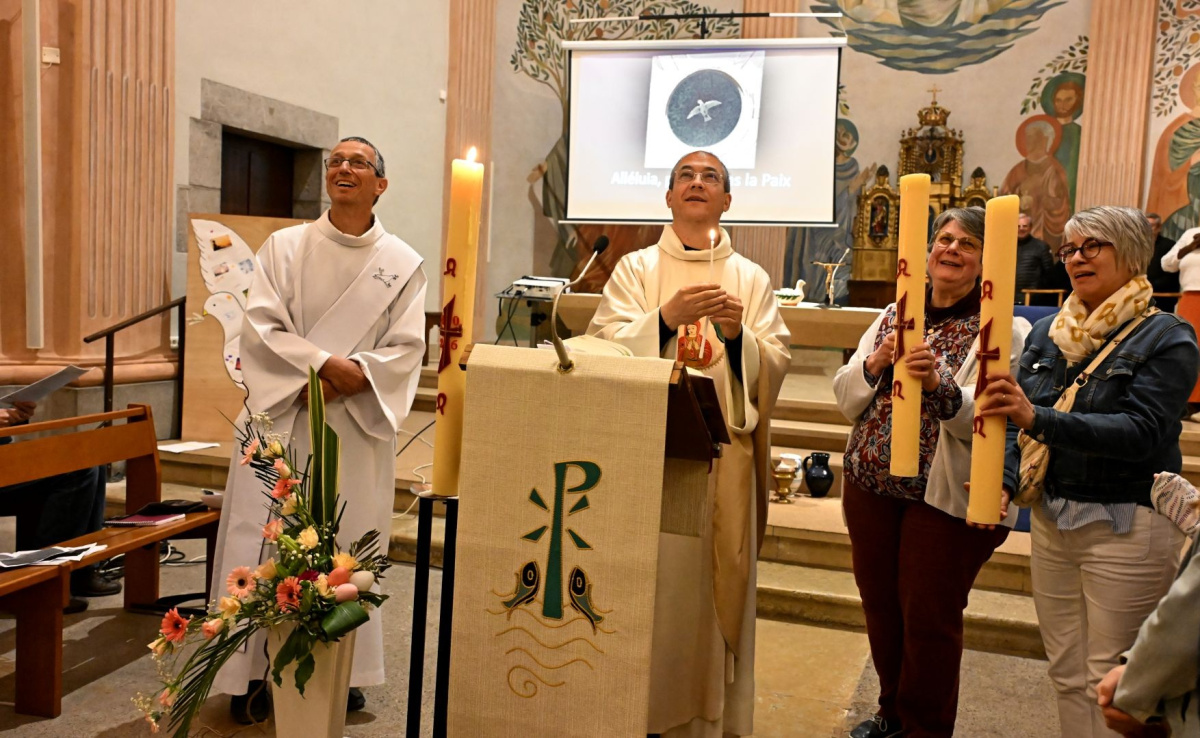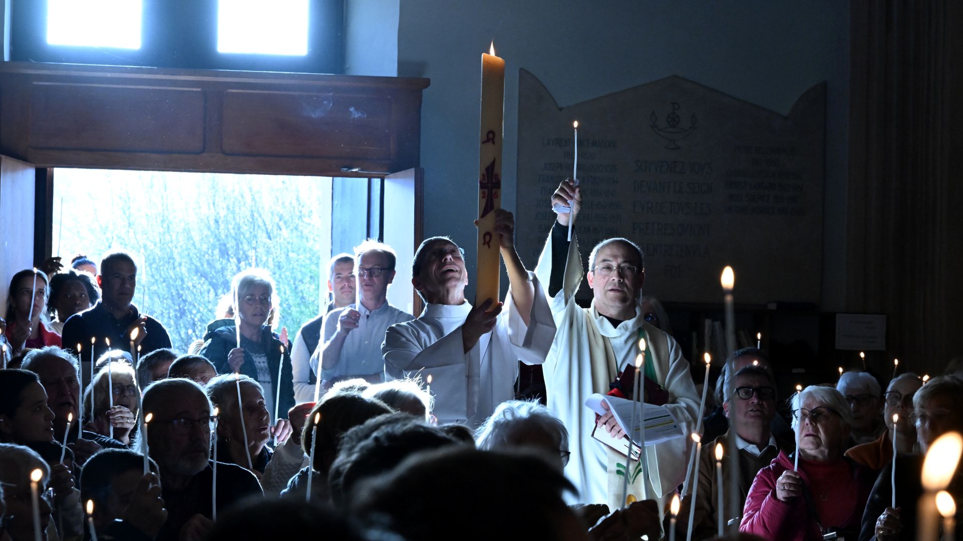 Après la bénédiction des cierges pascals des trois clochers la célébration s’est terminée en chantant :