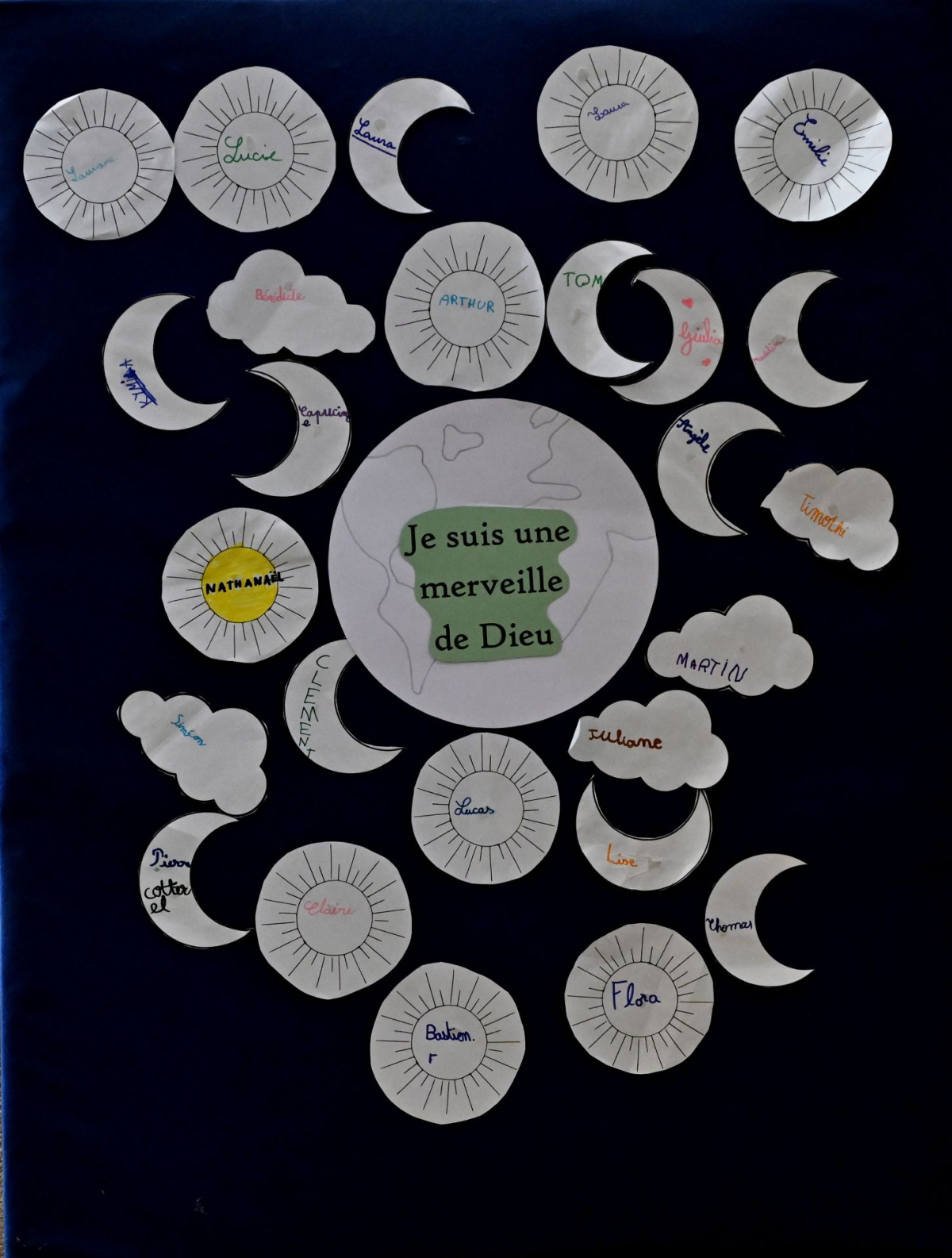Les enfants ont également apporté un panneau réalisé en octobre dernier, jour de la fête de St François d’Assise, un amoureux de la Création. Les enfants ont tous inscrits leur prénom car chacun de nous est merveille de Dieu.