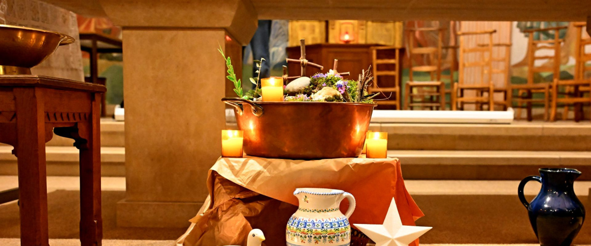 Après la lecture de l’Evangile on a enlevé la pierre dans le jardin de Pâques, puis les lumignons ont été placés autour du jardin et on met des pétales de fleurs pour montrer la joie de la Résurrection, la vie plus forte que la mort.